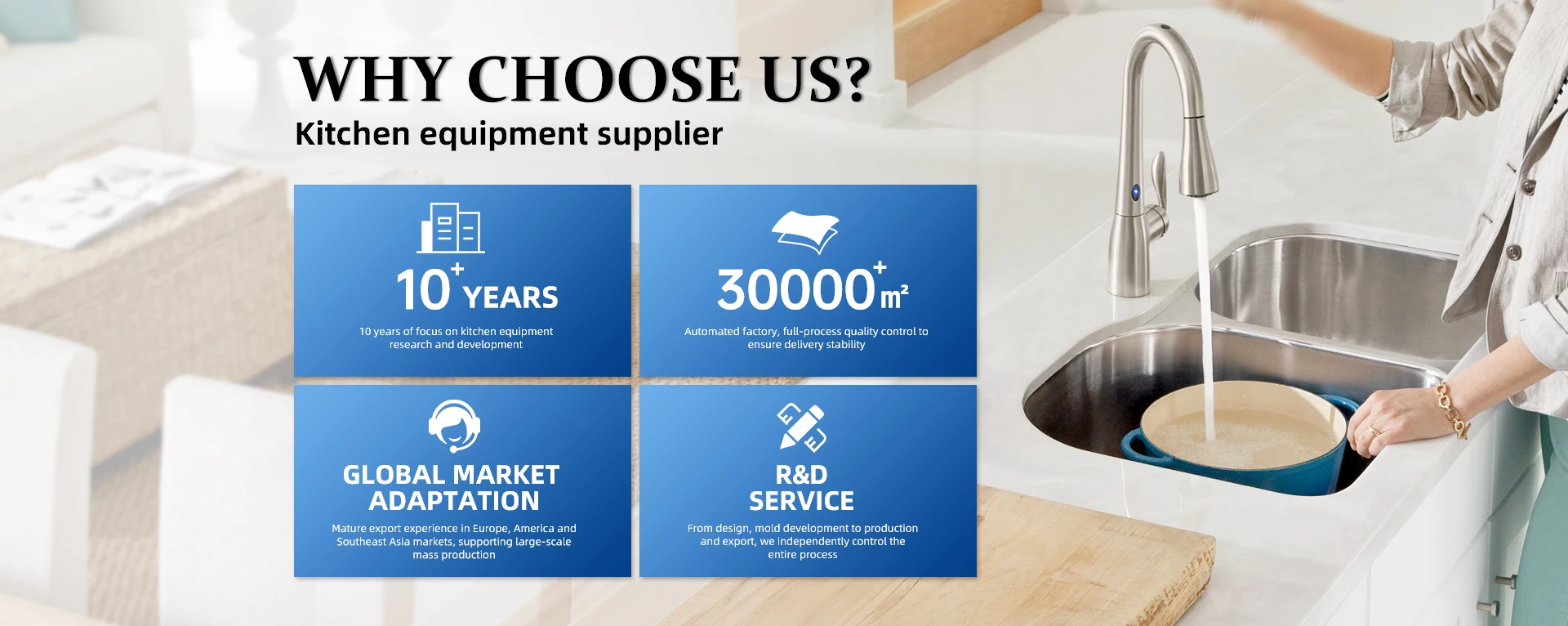 主营产品: 厨房水槽、油脂过滤器、厨房水龙头、盆水龙头、淋浴套件